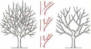 Bild 1: Auslichten der Krone: Entfernung von steil nach oben wachsenden Wasserschoßern, nach innen wachsenden Ästen und sich kreuzenden oder reibenden Trieben.