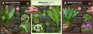 Das ist der Punkt, an dem ihr besonders achtsam sein müsst. Bärlauch hat zwei gefährliche Doppelgänger: das Maiglöckchen und die Herbstzeitlose. Beide sind hochgiftig.